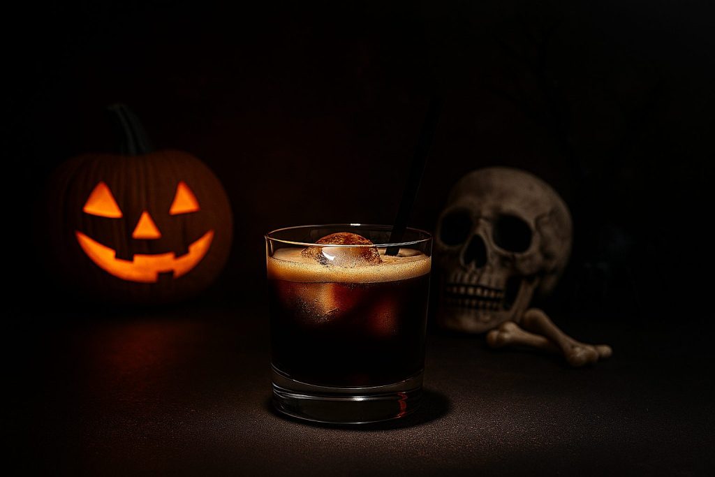 漆黒の液体がロックグラスに沈む様子は、ハロウィン特有の夜の闇を思わせます。